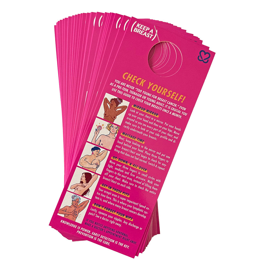 Educate your Fit 4 Prevention fundraiser attendees with Keep A Breast Check Yourself! (CYS) education cards! These door hangers outline how to do a self-check. Staying on top of your breast health and knowing your normal is so important for early detection. Hang a card in your bathroom, bedroom, or wherever you’d like a reminder to do your self-check!